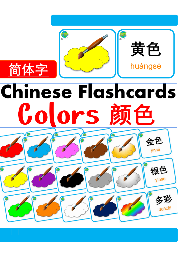 Thẻ flashcard tiếng Trung phổ thông để học màu sắc, với các ký tự tiếng Trung giản thể, bính âm và thanh điệu. Hoàn hảo để dạy từ vựng, trang trí lớp học, hoạt động ghép đôi, trò chơi nhóm và màn hình treo tường! Bản in PDF này bao gồm 23 trang thẻ hình ảnh khổ A4. Mỗi trang có 6 hình ảnh, một hình ảnh nhiều màu ở bên trái, bên cạnh chữ Hán giản thể, với cách phát âm bính âm và các dấu thanh điệu bên dưới.
