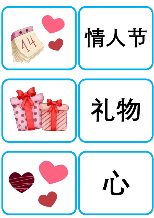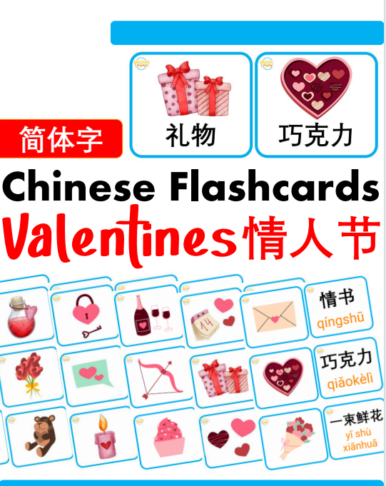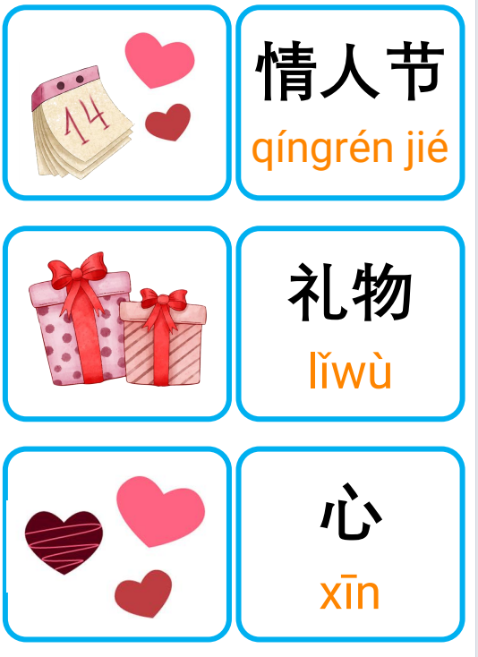 Thẻ Flashcard tiếng Trung chủ đề Ngày lễ tình nhân – bao gồm từ vựng với chữ Hán giản thể, pinyin có thanh điệu rõ ràng. Đây là tài liệu lý tưởng để giảng dạy từ vựng tiếng Trung, sử dụng cho trang trí lớp học, hoạt động ghép đôi, trò chơi nhóm, hoặc làm bảng treo tường sinh động. Phù hợp cho cả trẻ em và người học ở mọi trình độ!