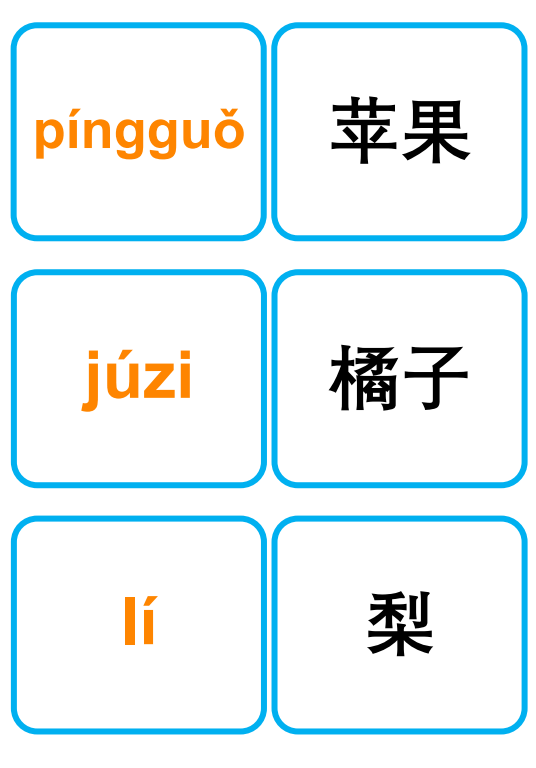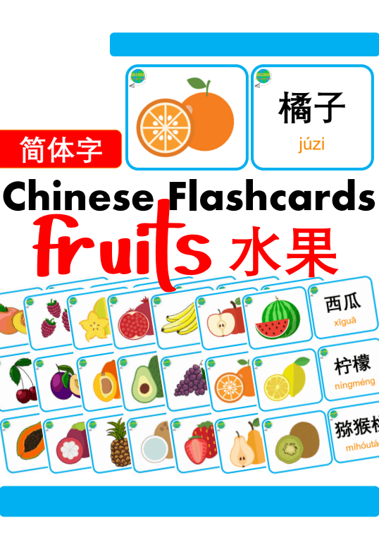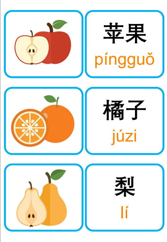 Thẻ Flashcard ghi nhớ tiếng Trung phổ thông để học từ vựng về trái cây, với các ký tự tiếng Trung giản thể, phiên âm và thanh điệu. Hoàn hảo để giáo viên dạy từ vựng, trang trí lớp học, hoạt động ghép đôi, trò chơi nhóm và trưng bày trên tường!