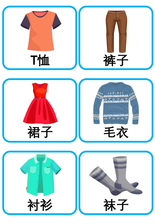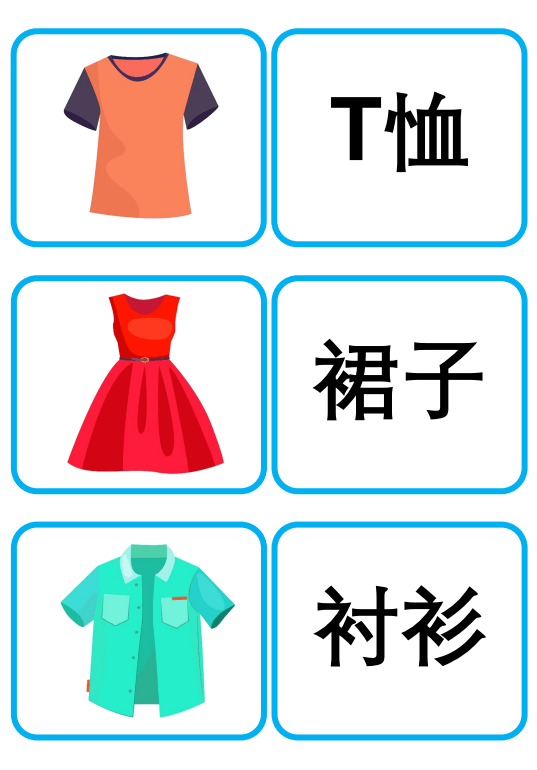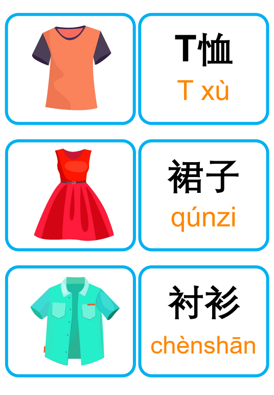 Bộ thẻ flashcard tiếng Trung chủ đề quần áo, thời trang và phụ kiện, bao gồm các từ vựng với chữ Hán giản thể, pinyin kèm thanh điệu, giúp ghi nhớ hiệu quả. Thích hợp cho việc giảng dạy từ vựng, trang trí lớp học, hoạt động ghép đôi, trò chơi nhóm, hoặc trưng bày sinh động trên tường lớp!