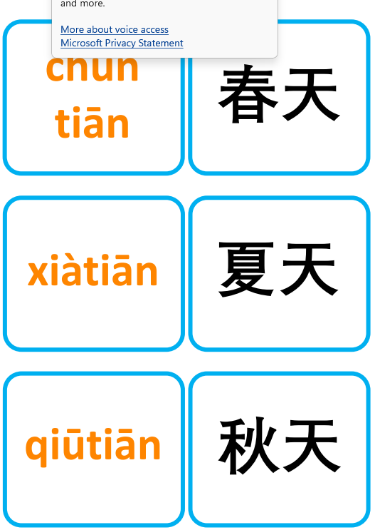 Thẻ Flashcard tiếng Trung chủ đề Thời tiết và Các mùa – bao gồm từ vựng với chữ Hán giản thể, pinyin có thanh điệu rõ ràng. Đây là tài liệu lý tưởng để giảng dạy từ vựng tiếng Trung, sử dụng cho trang trí lớp học, hoạt động ghép đôi, trò chơi nhóm, hoặc làm bảng treo tường sinh động. Phù hợp cho cả trẻ em và người học ở mọi trình độ!